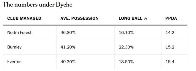数据也证实了这一点。在最基本的层面上,控球率高于他英超执教生涯的任何时期:在森林队,他们在联赛中的平均控球率达到46.3%(这个数字被对阵利物浦那场胜利中仅26%的控球率拉低了)。而在伯恩利是41.2%,在埃弗顿是40.3%(基于可追溯至2018-19赛季的统计数据)。