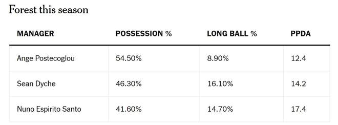 人们将这支球队与上赛季努诺的球队进行比较,两者有明显的风格相似之处,但一个不同点在于戴奇治下的森林队施压更猛。努诺更喜欢让他的球队大体上允许对手在本方半场控球:上赛季,他们在进攻三区完成的抢断次数是联赛中最少的,并且在这位葡萄牙教练手下,他们的“每次防守动作允许对手传球数”(PPDA)是17.4。而在戴奇手下,这一数字降至14.2,意味着他们的逼抢强度大得多。